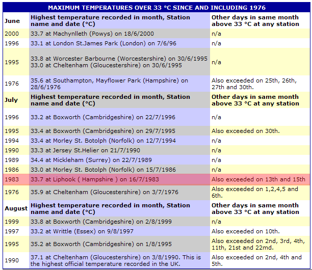 During the hot summer of 1983, Liphook hit the headlines as the hottest spot in the United Kingdom, but some of the temperature readings were claimed to be unnaturally high and are not universally accepted. [However, we were listed at the end of this web page "www.metoffice.com/climate/uk/interesting/15jul03maxtemps.html" - now removed by Met Office, but an archived copy can still be found at archive.org relevent section reproduced below - editor].
